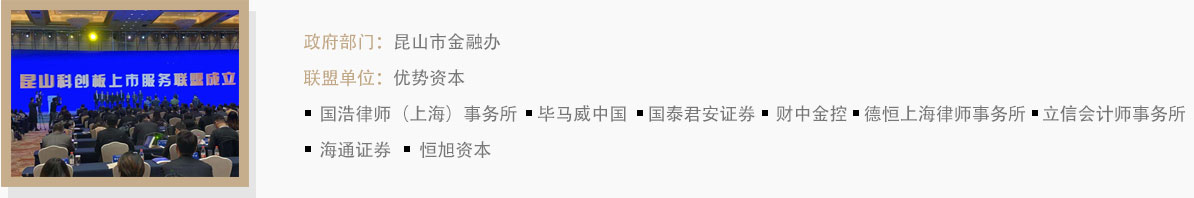 2019年12月12日,由昆山市金融辦主導(dǎo),優(yōu)勢資本聯(lián)合券商、投資機(jī)構(gòu)、律師事務(wù)所、會計師事務(wù)所和投資機(jī)構(gòu)成立“昆山科創(chuàng)板上市服務(wù)聯(lián)盟”掛牌成立,為當(dāng)?shù)鼐哂泻诵募夹g(shù)的成長型企業(yè)提供綜合服務(wù),對接資本市場。